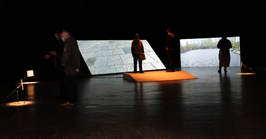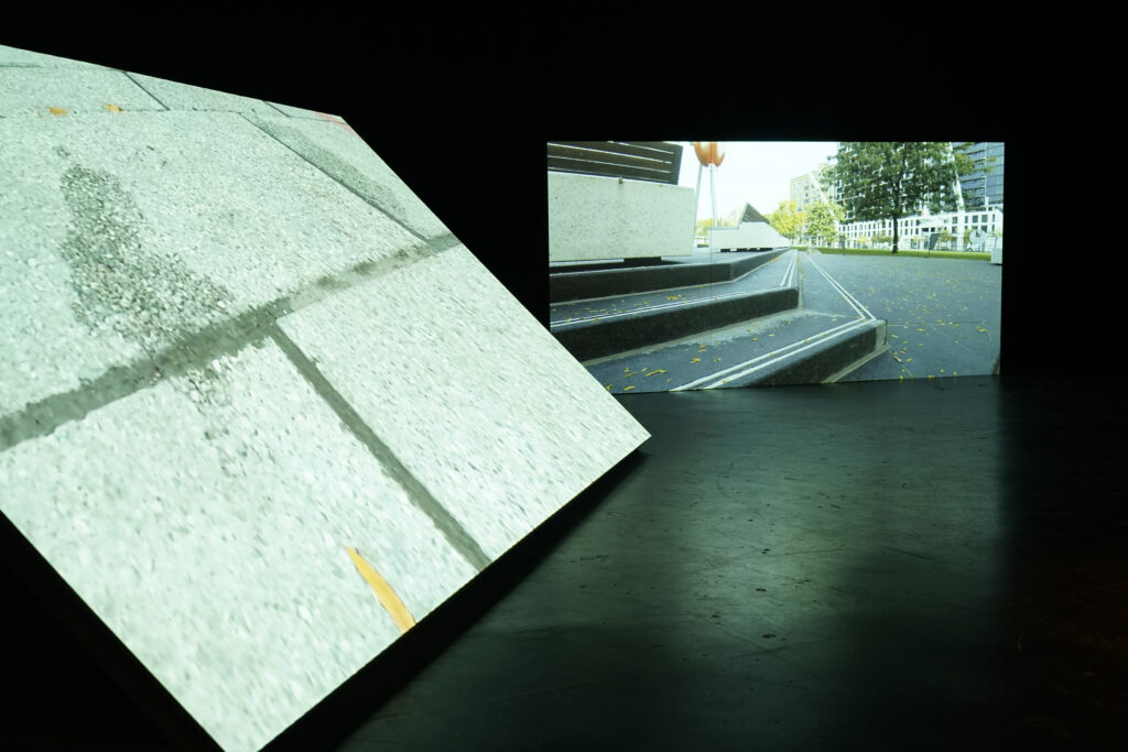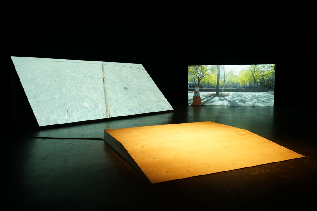 These video sequences are projected onto an oblique concrete screen where the surface of the ground moves at full speed, echoing the sounds of the skateboard produced by the friction of the wheels. This hypnotic kinetics reveals an invisible musicality of the city, due to the skateboard rolling in the grooves of the urban materiality, like a needle on a vinyl record. This sensory immersion is heightened by a wooden haptic module that transmits vibrations under visitors’ feet, using tactile transducers. Between two sequences, when the skateboard and its sounds come to a halt, the visitor’s gaze turns to a second video projection in the background to contemplate the overall shots of the places travelled through, whose varied urban soundscape is spatialised around the work.